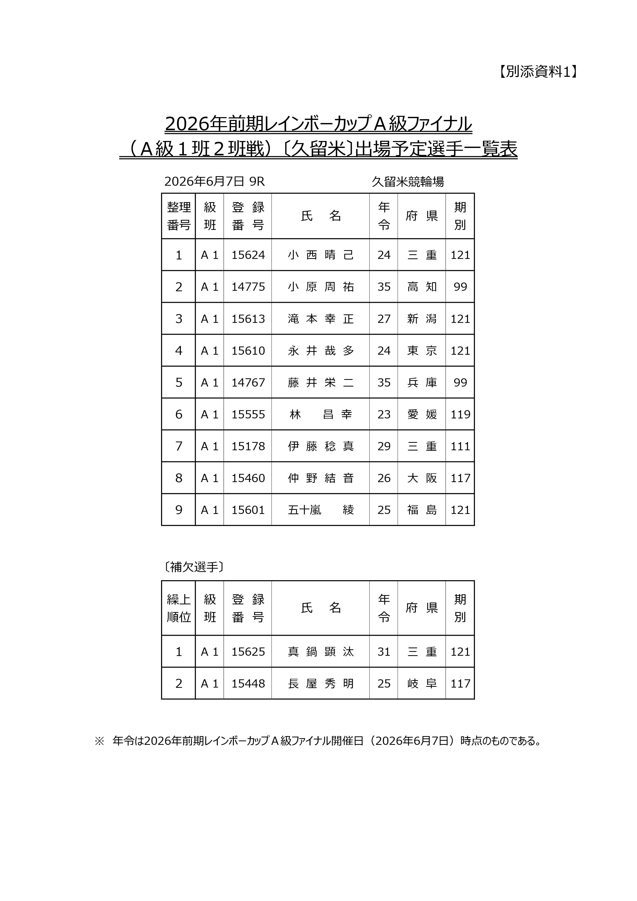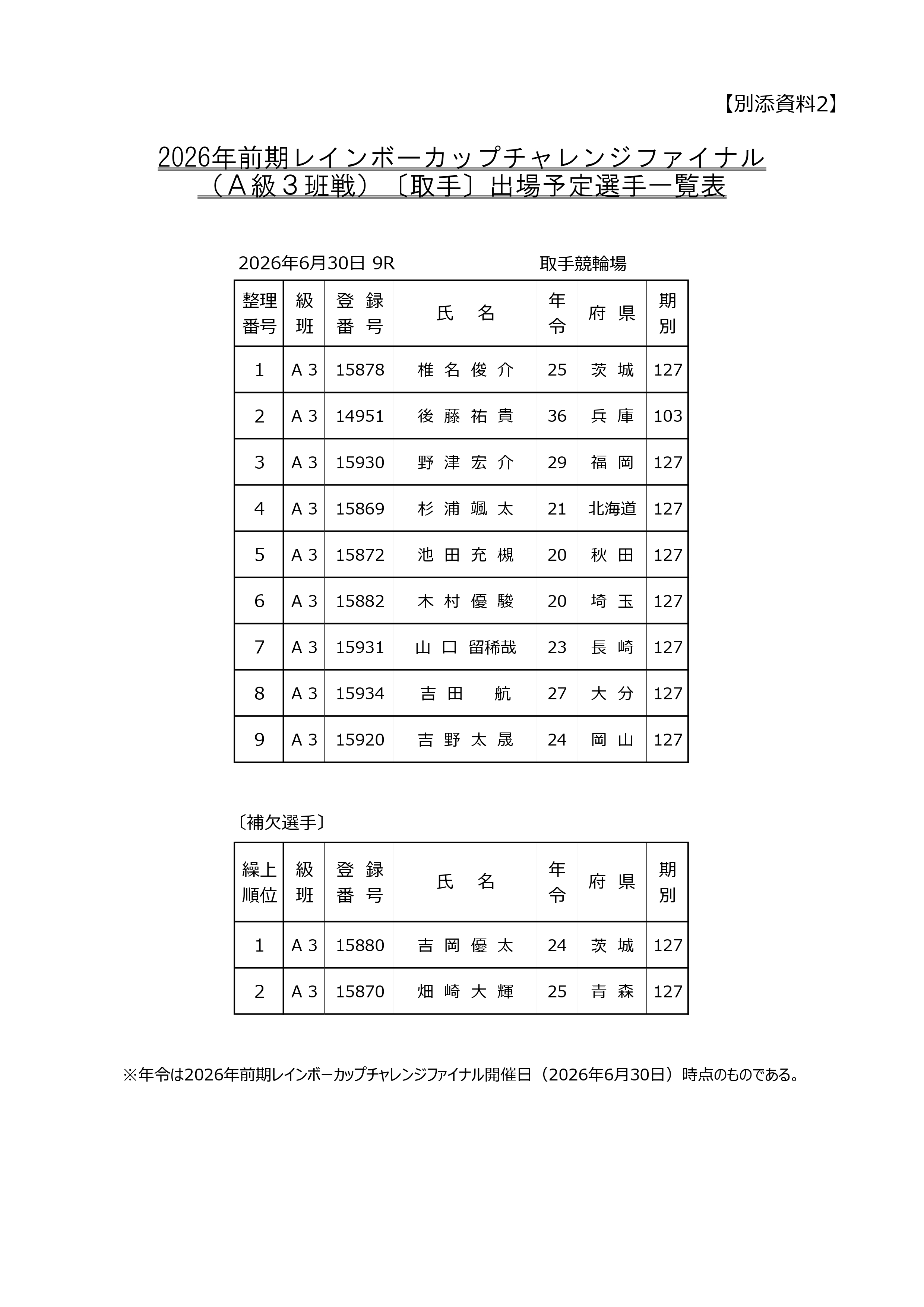 2026年前期レインボーカップの出場予定選手が決定しましたのでお知らせいたします。 なお、本レースの実施日については以下のとおりとなります。
