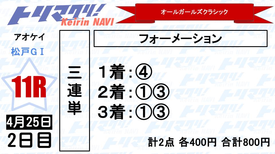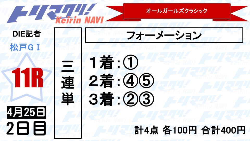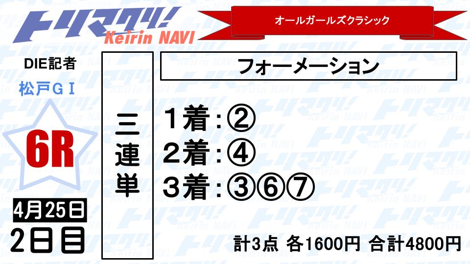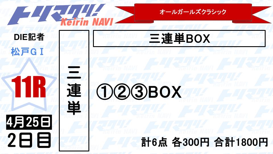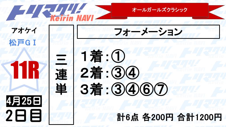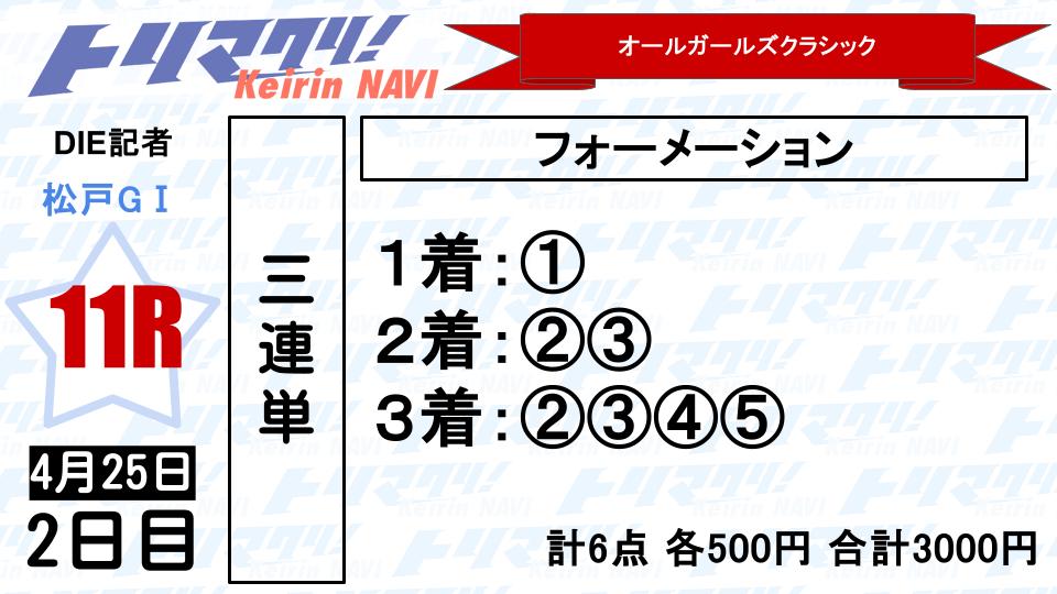 初日は一気のカマシで他を圧倒した②半田水晶がここも最有力。レース巧者④林真奈美が相手だが初日⑥濱田芽生の走りを見るとここも期待したくなる!