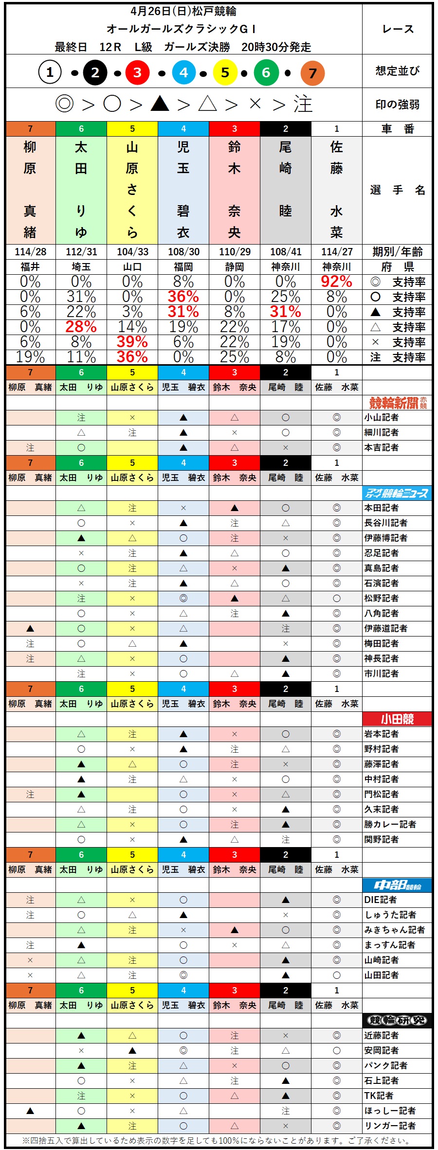 ×と注で支持率トップは⑤山原さくら。積極的な走りで連に絡めるか。
