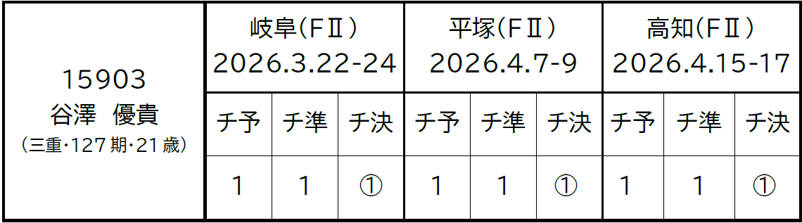 谷澤 優貴(たにざわ ゆうき)選手〔三重・127期〕が2026年4月15日から開催されておりました、高知競輪(FⅡ・モーニング)の開催において3日間連続1着となり、特別昇班の対象となる開催を3場所連続完全優勝し、明日(4月18日)付で『A級2班』へ特別昇班いたしますので、お知らせいたします。