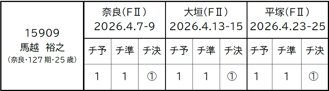 馬越 裕之(うまこし ひろゆき)選手〔奈良・127期〕が2026年4月23日から開催されておりました、平塚競輪(FⅡ)の開催において3日間連続1着となり、特別昇班の対象となる開催を3場所連続完全優勝し、明日(4月26日)付で『A級2班』へ特別昇班いたしますので、お知らせいたします。
