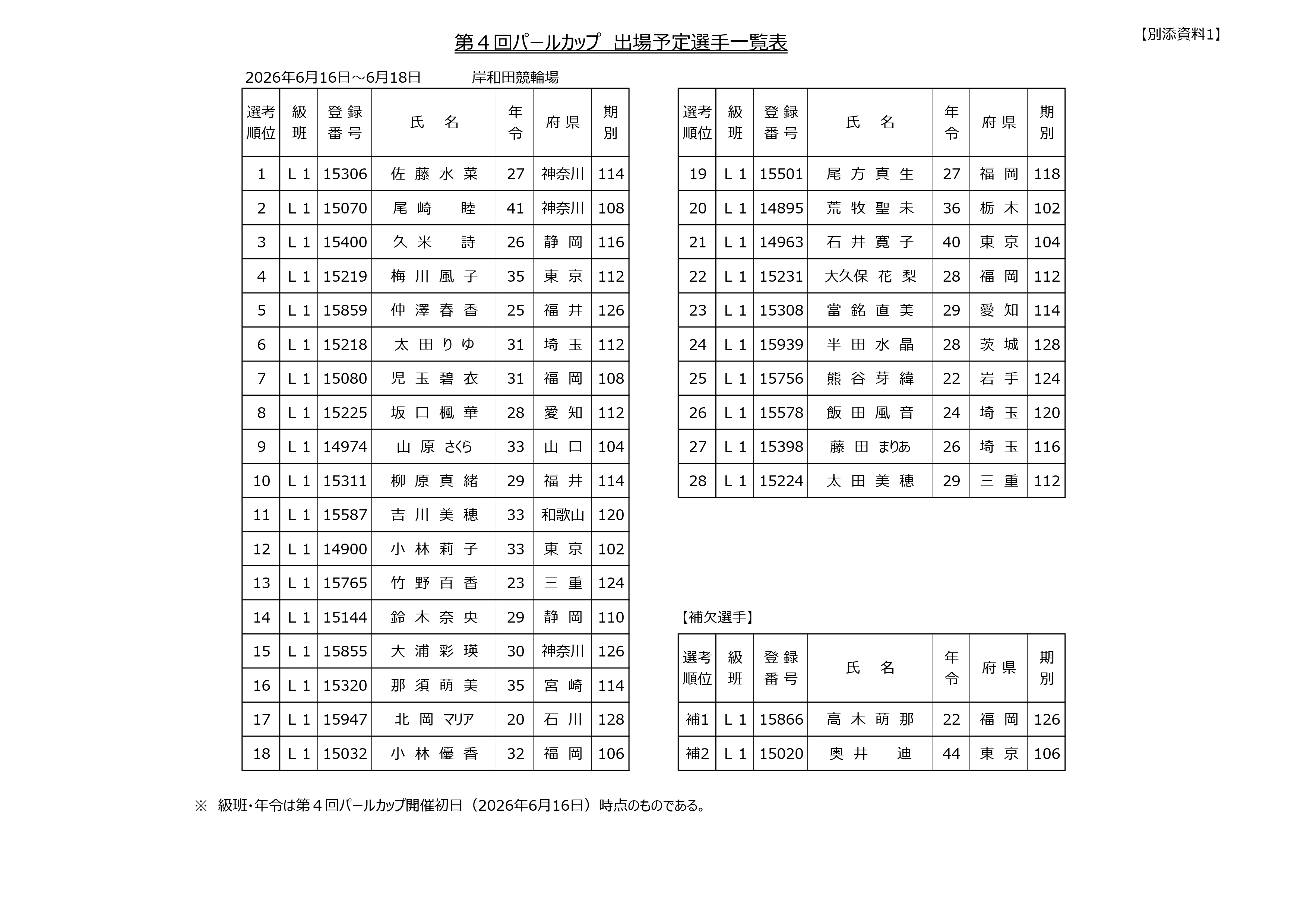 2026年6月16日(火)から18日(木)までの3日間、岸和田競輪場において開催される『第4回パールカップ』の出場予定選手が決定しましたので、お知らせいたします。